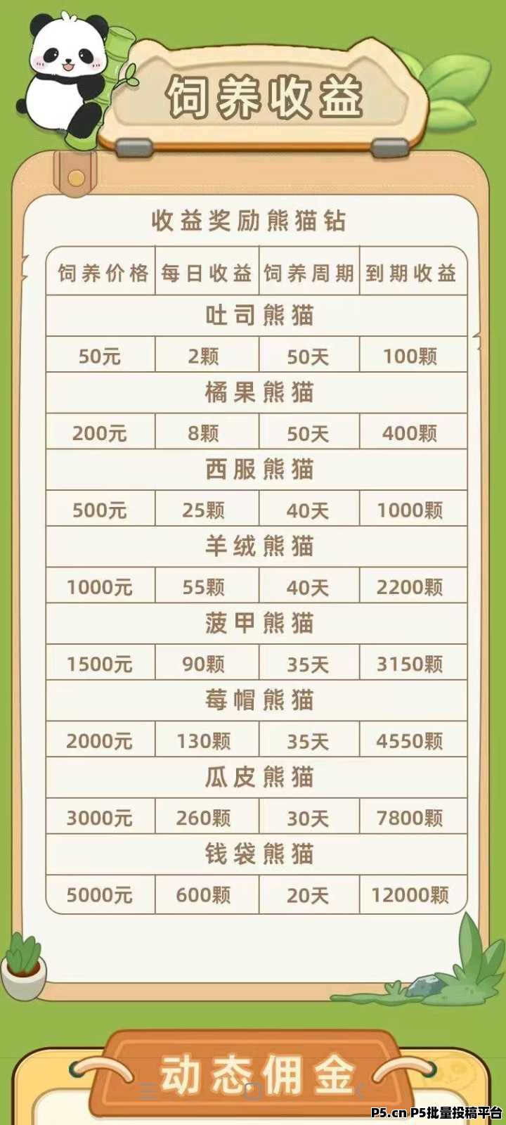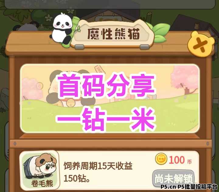 财运熊猫首码正式上线啦,全新萌宠养成类游戏模式,保底收益高,熊猫每天都能自动产出钻石,拥有的熊猫越多,产出的钻石越多,目前一钻=1元,另外每直推一位好友得15钻奖励,只需1米极速提,抢先首码先吃肉。